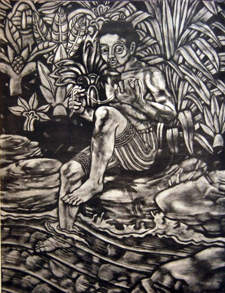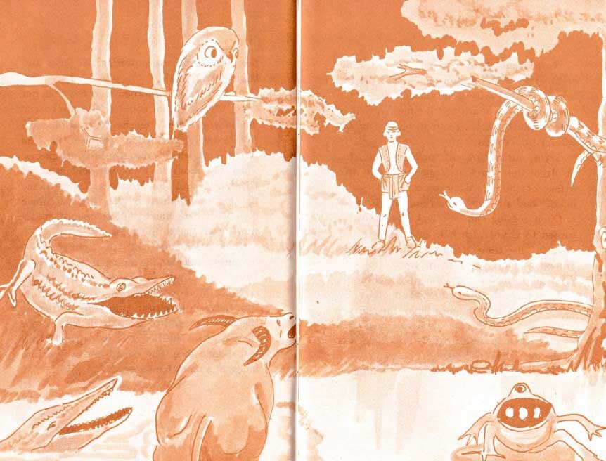 But the much-adored Handyong was terribly unhappy, for deep in the forest lived monsters. Punong-the one-eyed, three throated creature, the wild carabaos, the gigantic crocodiles and the snakes that lived in Mount Hantik were his enemies. These beasts were led by the wily serpent, Oryol, who was difficult to destroy, for she was more cunning than Handyong.